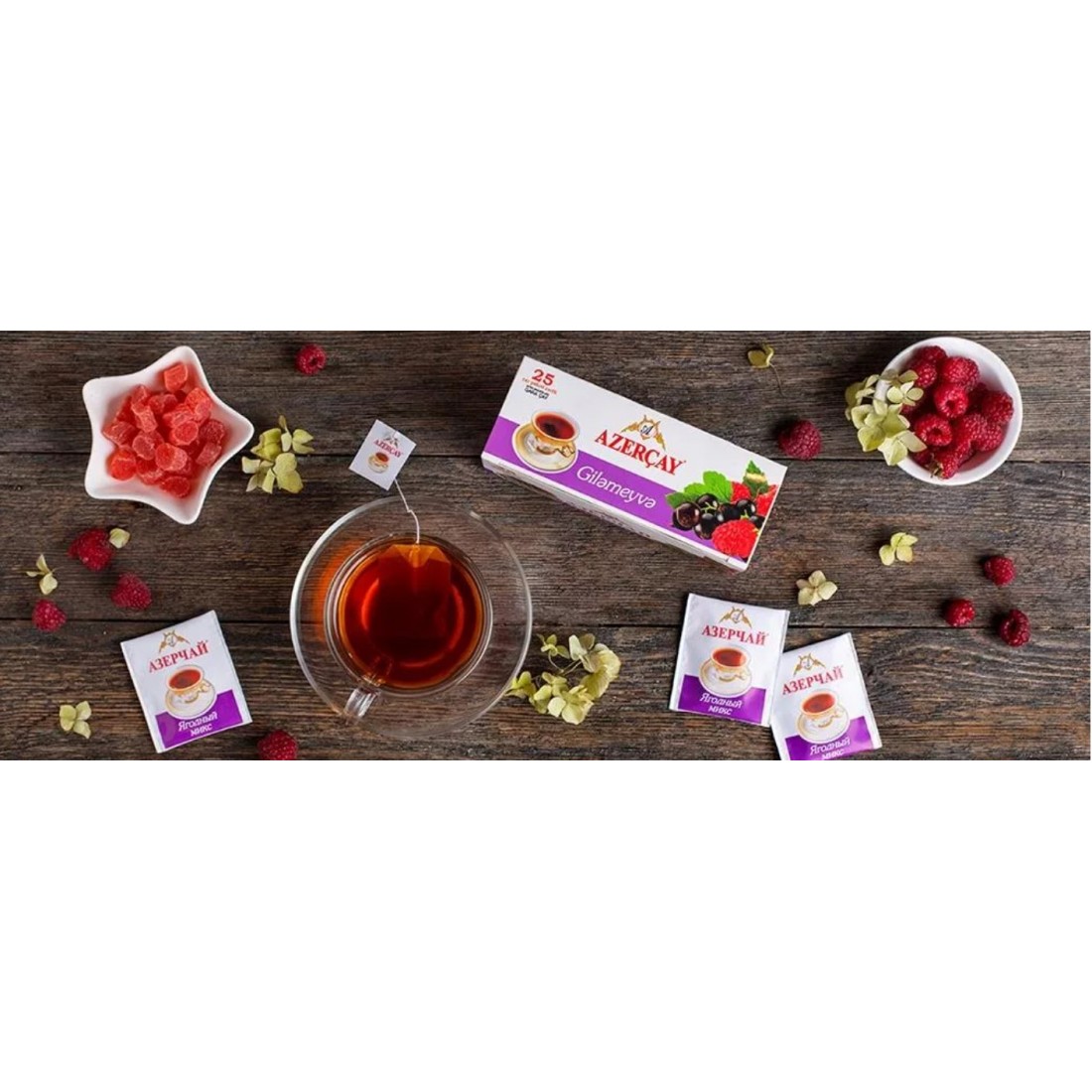 Azercay Berry Gilameyva jest czarną herbatą, pochodzącą z Azerbejdżanu z dodatkiem naturalnego aromatu owoców leśnych w saszetkach.